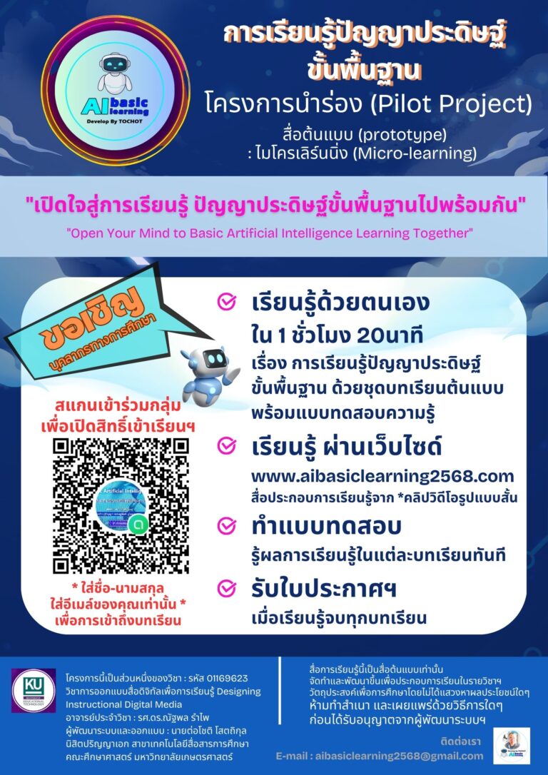 "Open Your Mind to Basic Artificial Intelligence Learning Together" "เปิดใจสู่การเรียนรู้ ปัญญาประดิษฐ์ขั้นพื้นฐานไปพร้อมกัน" สื่อต้นแบบ (prototype): ไมโครเลริ์นนิ่ง (Micro-Learning)รูปแบบชุดบทเรียน เรื่อง การเรียนรู้ปัญญาประดิษฐ์ขั้นพื้นฐานและแบบทดสอบความรู้สำหรับผู้เรียน เข้าสู่บทเรียน